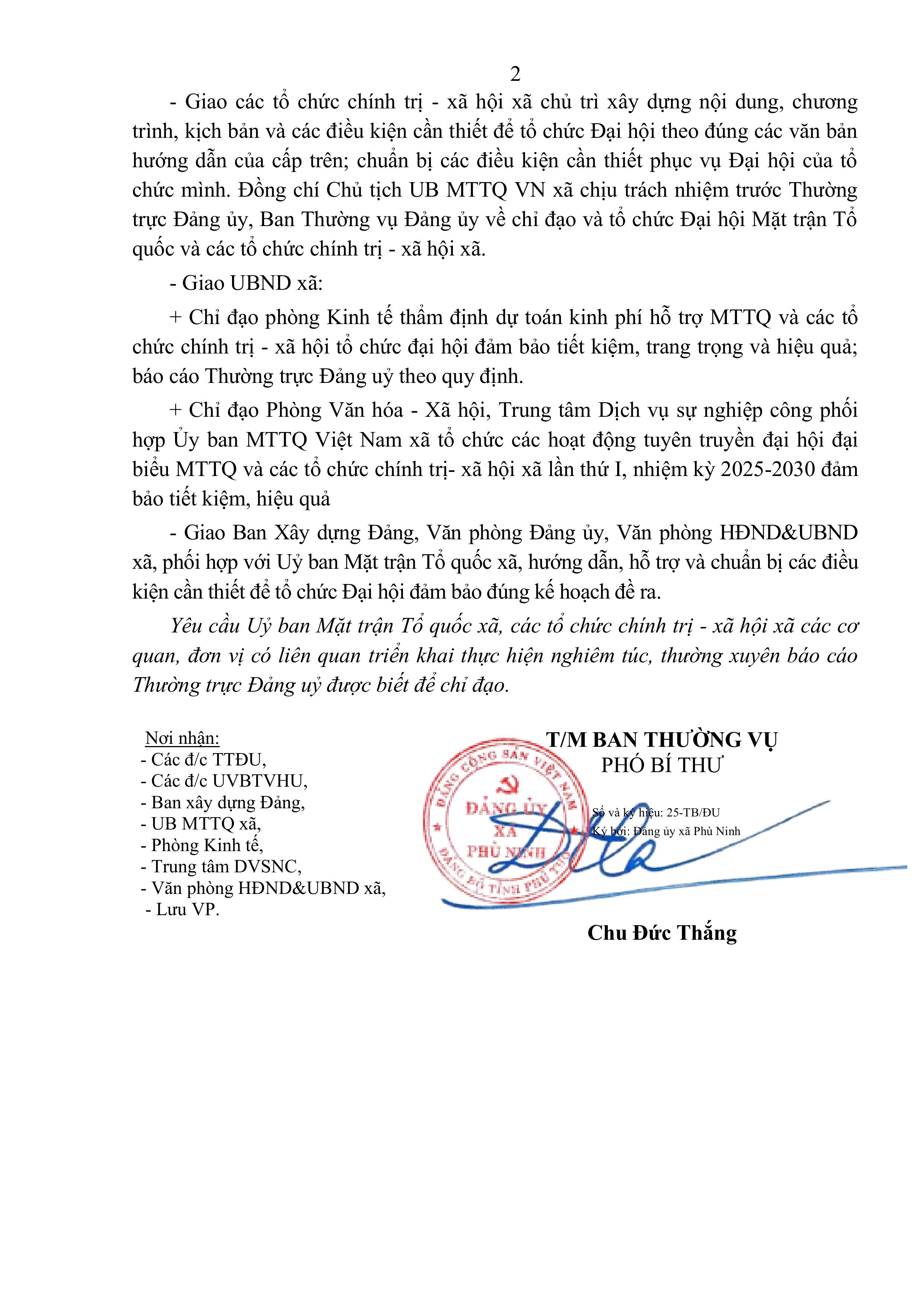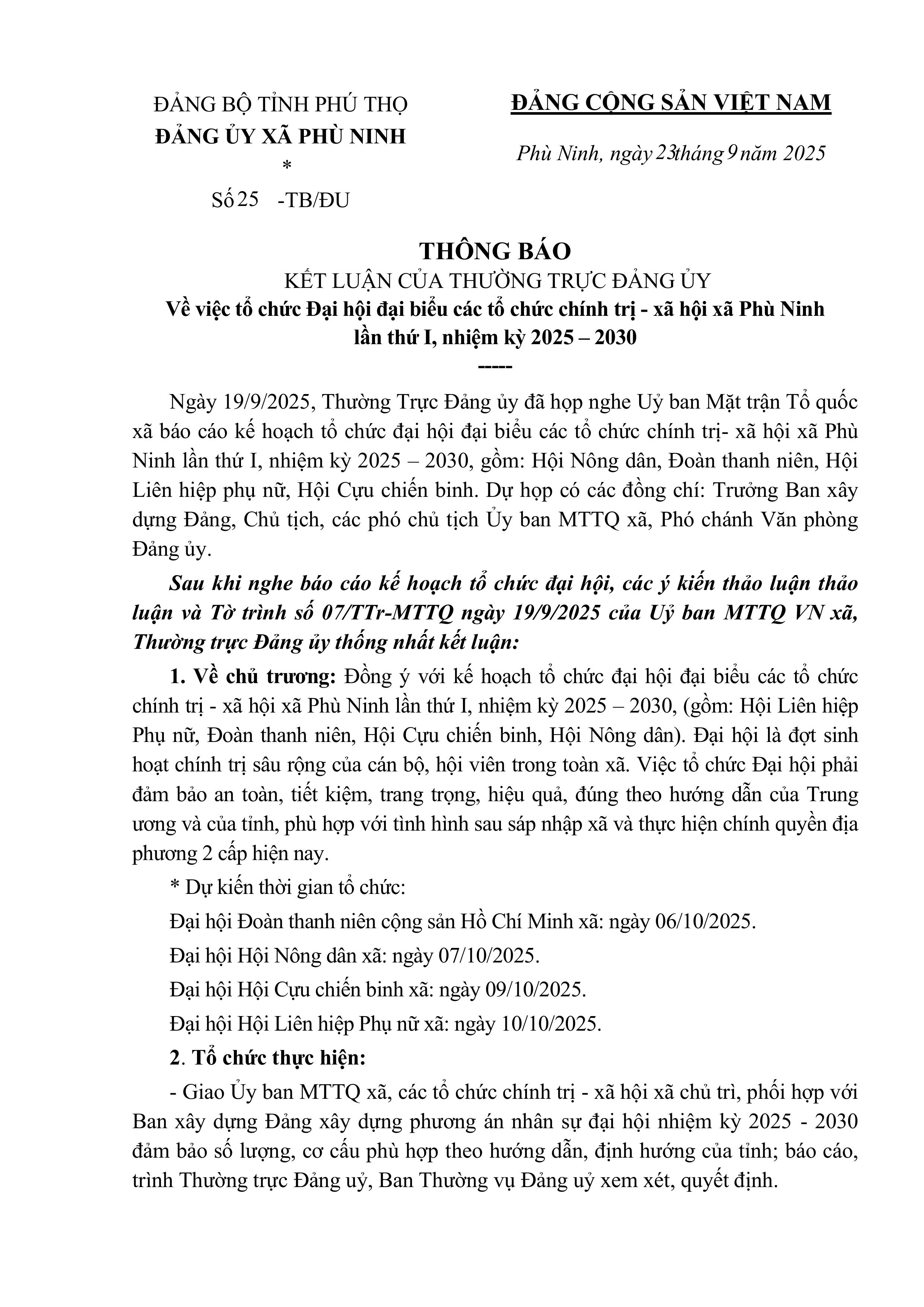 THÔNG BÁO KẾT LUẬN CỦA THƯỜNG TRỰC ĐẢNG ỦY Về việc tổ chức Đại hội đại biểu các tổ chức chính trị - xã hội xã Phù Ninh lần thứ I, nhiệm kỳ 2025 – 2030