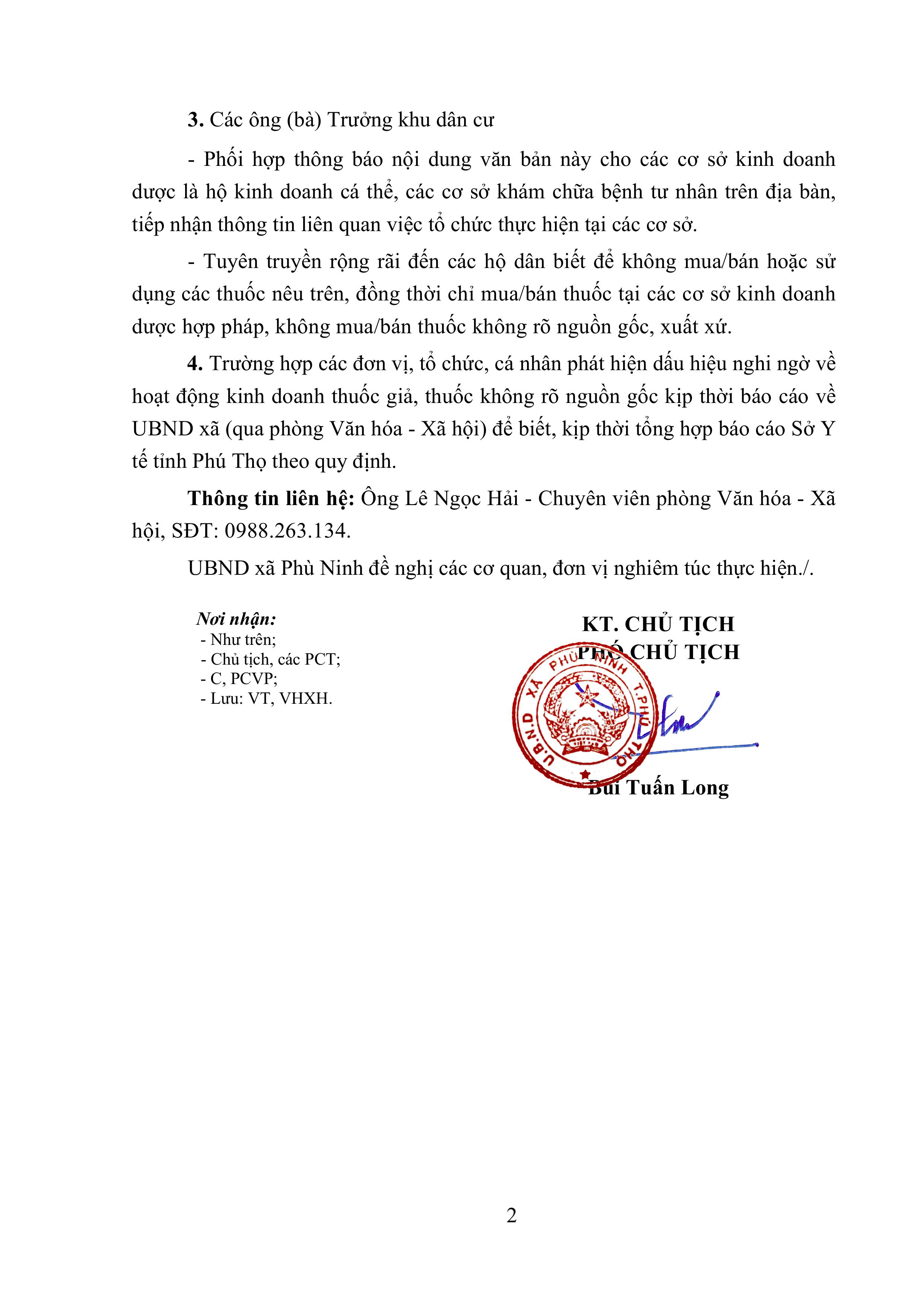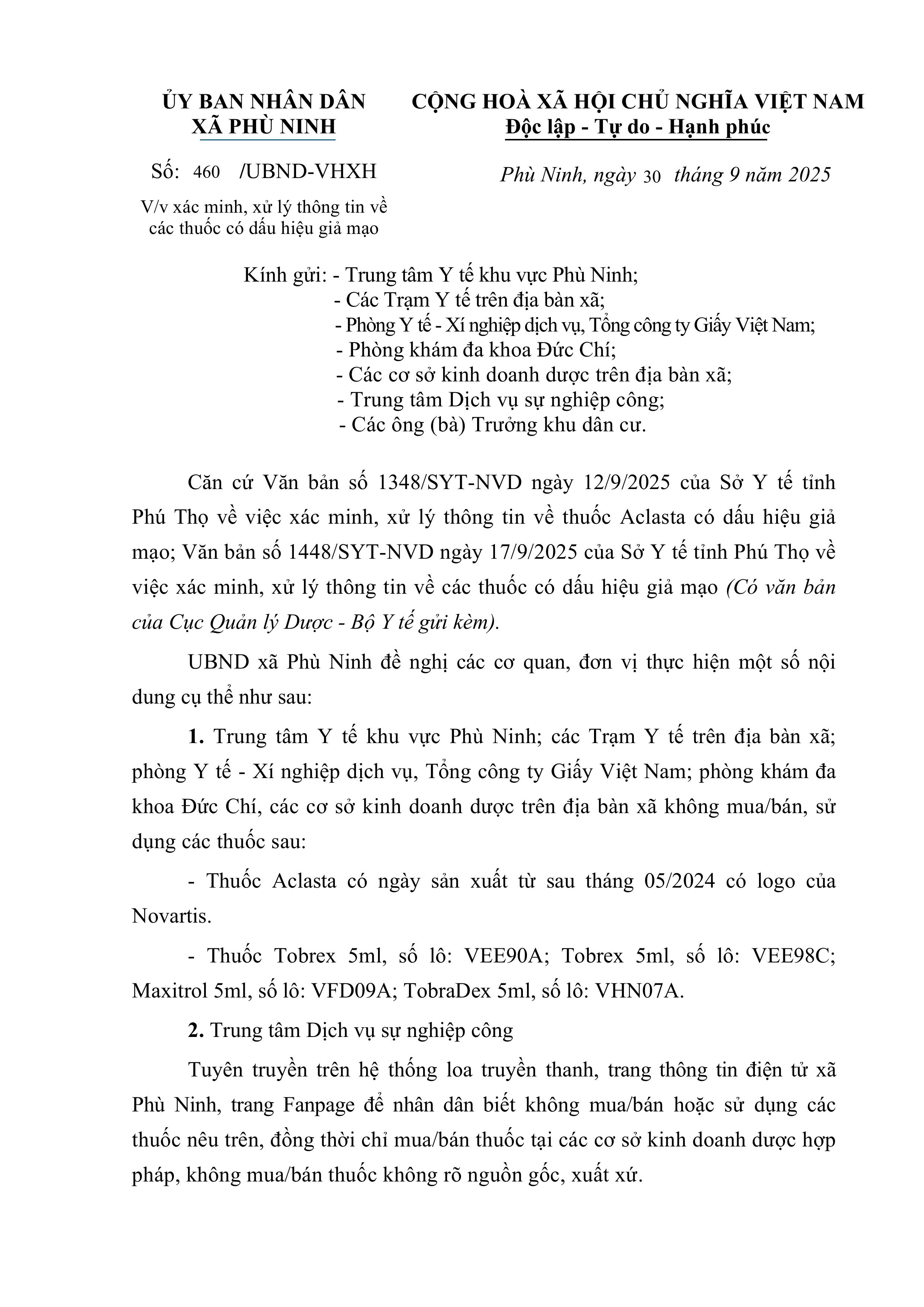 Công văn của UBND xã Phù Ninh V/v xác minh, xử lý thông tin về các thuốc có dấu hiệu giả mạo