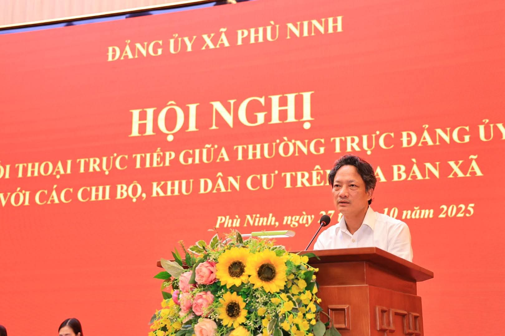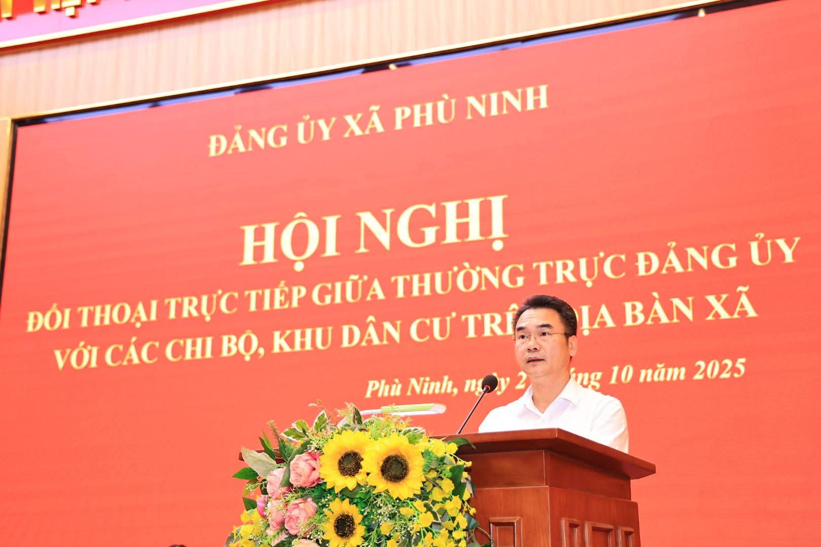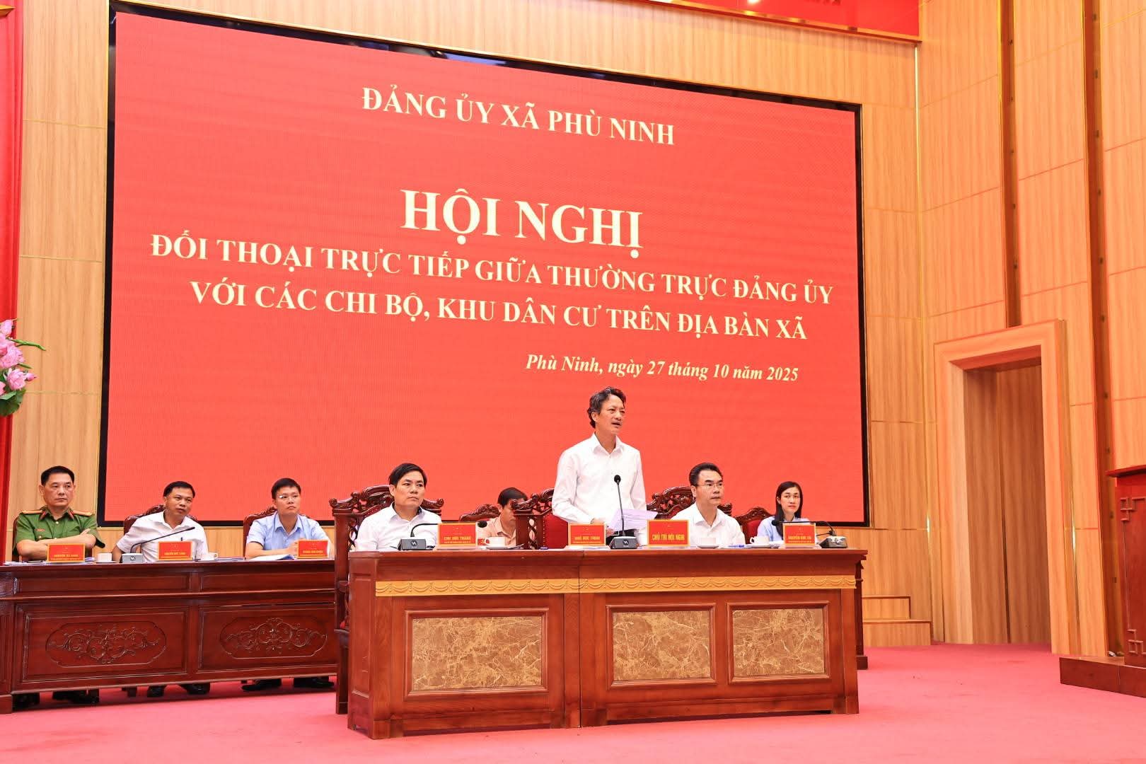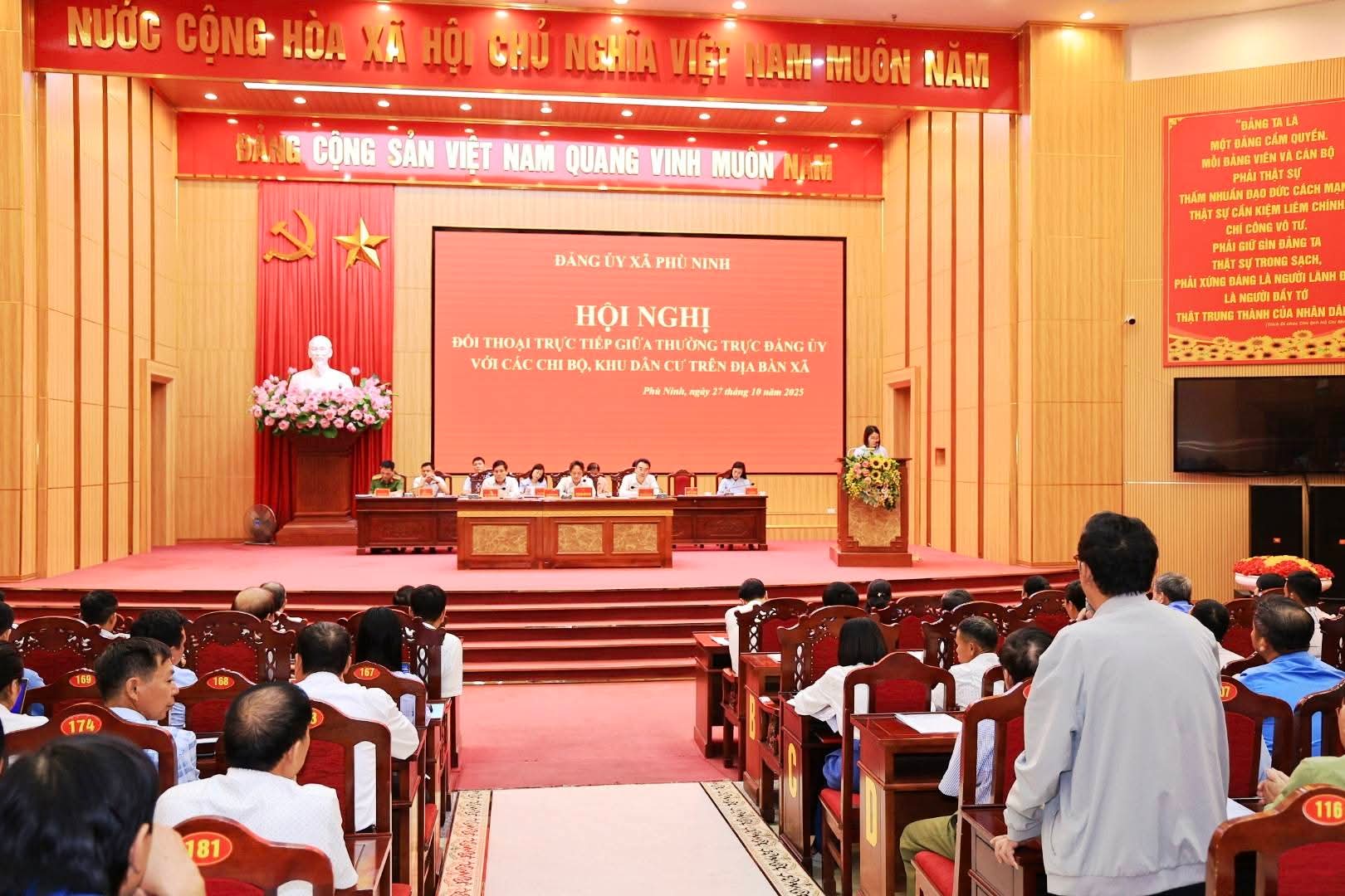 Chiều ngày 27/10/2025, Thường trực Đảng ủy xã Phù Ninh tổ chức Hội nghị đối thoại trực tiếp với các chi bộ, khu dân cư trên đại bàn xã nhằm nắm bắt tâm tư, nguyện vọng và kịp thời giải quyết những vấn đề người dân quan tâm. Đồng chí Ngô Đức Thịnh - TUV, Bí thư Đảng ủy, Chủ tịch HĐND xã; Đồng chí Nguyễn Đức Tài - Phó bí thư, Chủ tịch UBND xã; Đồng chí Chu Đức Thắng - Phó bí thư Thường trực Đảng ủy đồng chủ trì hội nghị. Tham dự hội nghị có các đồng chí lãnh đạo HĐND, Lãnh đạo UBND, các đồng chí Uỷ viên BTV, Uỷ viên Ban chấp hành, trưởng các phòng ban ngành đoàn thể của xã; các đồng chí bí thư chi bộ, trưởng khu của 57 khu dân cư trên địa bàn xã.