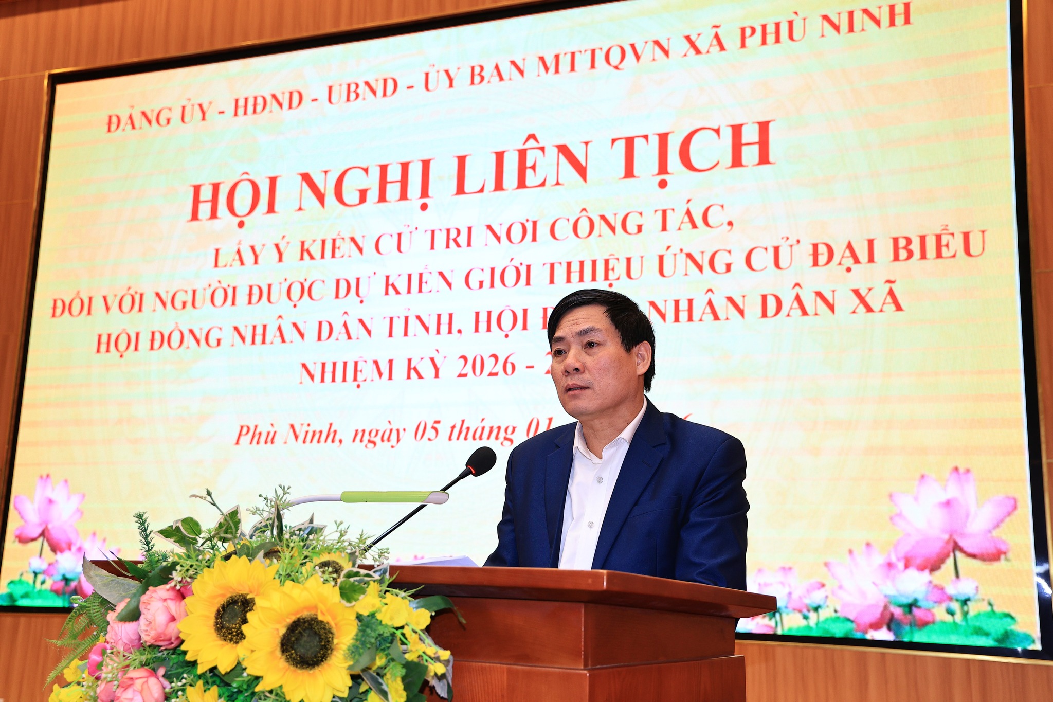 Tại hội nghị đã công bố cơ cấu, danh sách trích ngang, quá trình công tác, phẩm chất chính trị, đạo đức, lối sống của 03 đồng chí được giới thiệu ứng cử Đại biểu HĐND tỉnh Phú Thọ khóa XX, nhiệm kỳ 2026 – 2031; Danh sách 35 đồng chí được giới thiệu ứng cử đại biểu HĐND xã Phù Ninh, nhiệm kỳ 2026 - 2031; Trong đó cơ quan khối Đảng 8 người; Mặt trận tổ quốc 8 người và Cơ quan khối Chính quyền 19 người. Các nhân sự được giới thiệu đều đáp ứng đầy đủ các tiêu chuẩn của Đại biểu HĐND theo quy định của pháp luật, có năng lực và uy tín để đại diện cho ý chí, nguyện vọng của nhân dân.