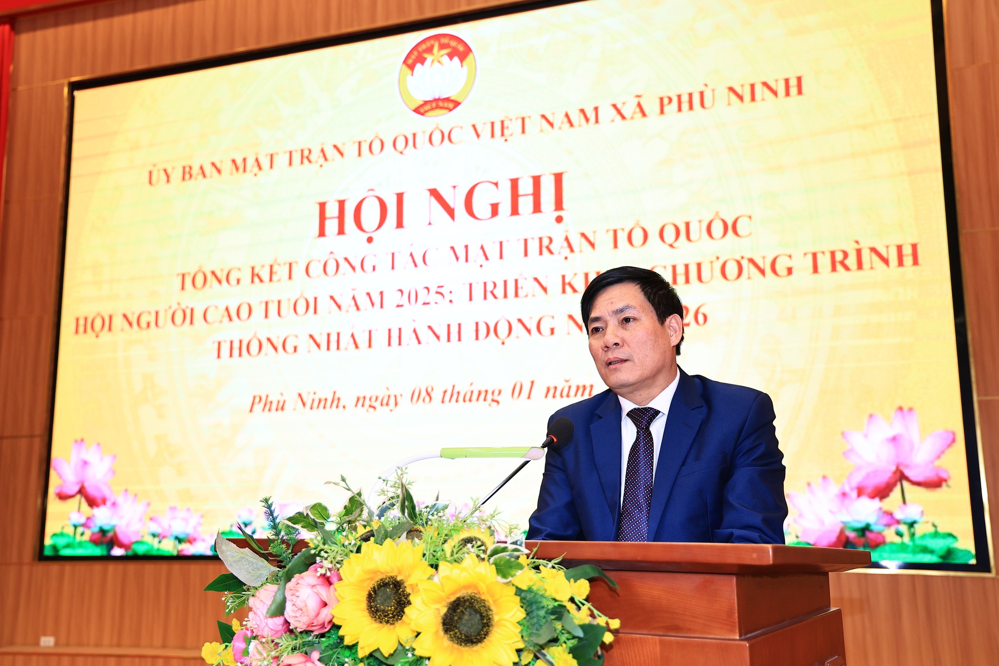 Ngày 08/1/2026, Ủy ban Mặt trận Tổ quốc Việt Nam, Hội người cao tuổi xã Phù Ninh tổ chức Hội nghị tổng kết công tác năm 2025, triển khai phương hướng, nhiệm vụ năm 2026. Hội nghị là dịp quan trọng để đánh giá toàn diện kết quả hoạt động của hệ thống Mặt trận và các đoàn thể chính trị – xã hội trong năm đầu tiên sau sáp nhập, đồng thời xác định rõ mục tiêu, nhiệm vụ trong giai đoạn tiếp theo. Dự hội nghị có đồng chí Chu Đức Thắng – Phó bí thư Thường trực Đảng ủy; Đồng chí Lê Thành Sơn - Ủy viên BTV Đảng ủy, Phó chủ tịch HĐND xã; Các đồng chí Ủy viên BTV Đảng ủy; Trưởng các phòng, ban, ngành đoàn thể của xã; Các đồng chí ủy viên Ủy Ban MTTQ, Ban chấp hành các Hội đoàn thể; Bí thư chi bộ, trưởng khu, Ban công tác mặt trận các khu dân cư trên địa bàn.