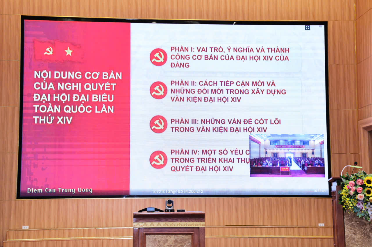 Hội nghị được diễn ra trong 01 ngày, với 10 chuyên đề bao gồm các nội dung cốt lõi, những vấn đề mới trong các văn kiện Đại hội XIV của Đảng: Nghị quyết Đại hội lần thứ XIV; Báo cáo chính trị của Ban Chấp hành Trung ương Đảng khóa XIII tại Đại hội đại biểu toàn quốc lần thứ XIV của Đảng; Chương trình hành động của Ban Chấp hành Trung ương Đảng thực hiện Nghị quyết Đại hội đại biểu toàn quốc lần thứ XIV của Đảng; Báo cáo tổng kết một số vấn đề lý luận và thực tiễn về công cuộc đổi mới theo định hướng xã hội chủ nghĩa trong 40 năm qua ở Việt Nam; Báo cáo tổng kết 15 năm thi hành Điều lệ Đảng (2011- 2025) và đề xuất, định hướng bổ sung, sửa đổi Điều lệ Đảng, Đề cương tổng kết 100 năm Đảng lãnh đạo cách mạng Việt Nam (1930 - 2030), định hướng, lãnh đạo phát triển đất nước trong 100 năm tiếp theo (2030 - 2130) và Tổng kết 40 năm thực hiện Cương lĩnh xây dựng đất nước trong thời kỳ quá độ đi lên chủ nghĩa xã hội...