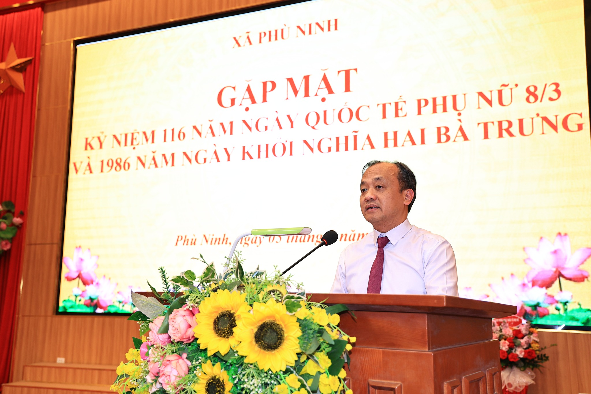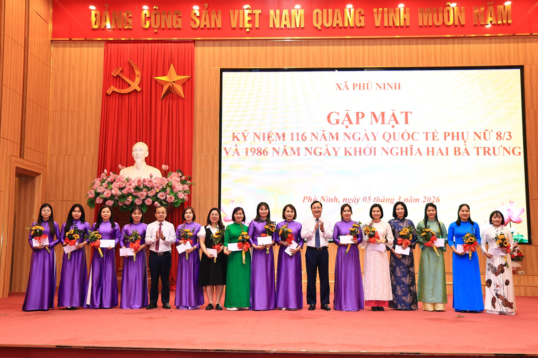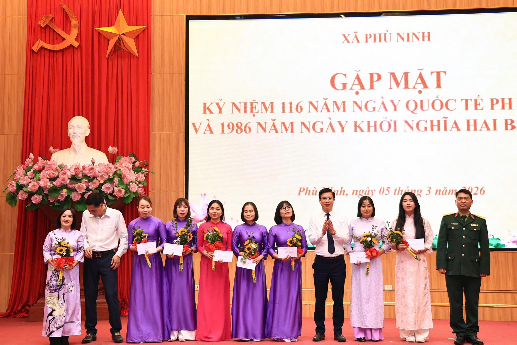 Ngày 05/3/2026, Ban Vì sự tiến bộ của phụ nữ xã Phù Ninh tổ chức buổi gặp mặt Kỷ niệm 116 năm Ngày Quốc tế Phụ nữ (08/3/1910 - 08/3/2026) và 1986 năm cuộc Khởi nghĩa Hai Bà Trưng. Dự gặp mặt có đồng chí Ngô Đức Thịnh – TUV, Bí thư Đảng ủy, Chủ tịch HĐND xã; Đồng chí Nguyễn Đức Tài – Phó bí thư, Chủ tịch UBND xã; Đồng chí Chu Đức Thắng – Phó bí thư Thường trực Đảng ủy; Các đồng chí lãnh đạo HĐND, UBND xã; Các đồng chí Ủy viên BTV Đảng ủy, Ủy viên BCH Đảng bộ xã; Lãnh đạo các phòng, ban, ngành cùng toàn thể nữ cán bộ, công chức, viên chức và người lao động đang công tác tại các phòng, ban chuyên môn của xã.