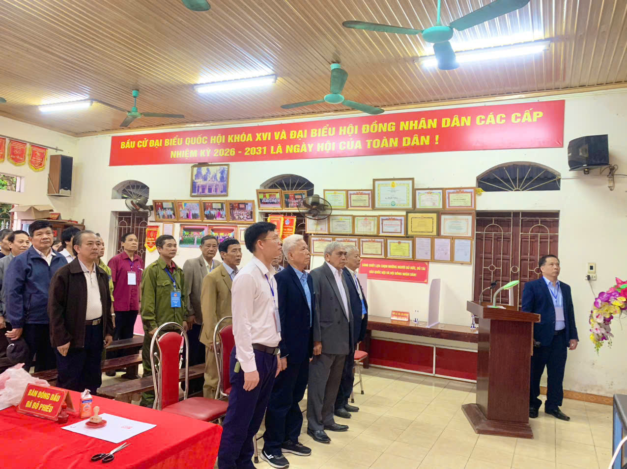 Mở đầu buổi lễ là nghi thức chào cờ trang nghiêm, thể hiện tinh thần trách nhiệm và niềm tự hào của mỗi công dân khi thực hiện quyền và nghĩa vụ thiêng liêng của mình. Sau đó, đại diện Tổ bầu cử đã tuyên bố lý do, giới thiệu đại biểu tham dự và nhấn mạnh ý nghĩa quan trọng của cuộc bầu cử – sự kiện chính trị lớn của đất nước, là dịp để cử tri phát huy quyền làm chủ, lựa chọn những đại biểu tiêu biểu, xứng đáng đại diện cho ý chí và nguyện vọng của nhân dân.